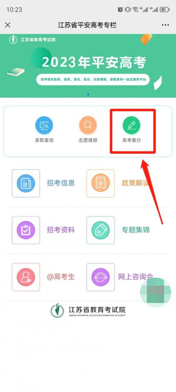 进入“江苏招生考试”微信公众号,点击菜单栏“平安高考”,进入后点击“高考查分”,输入相关信息点击查询即可